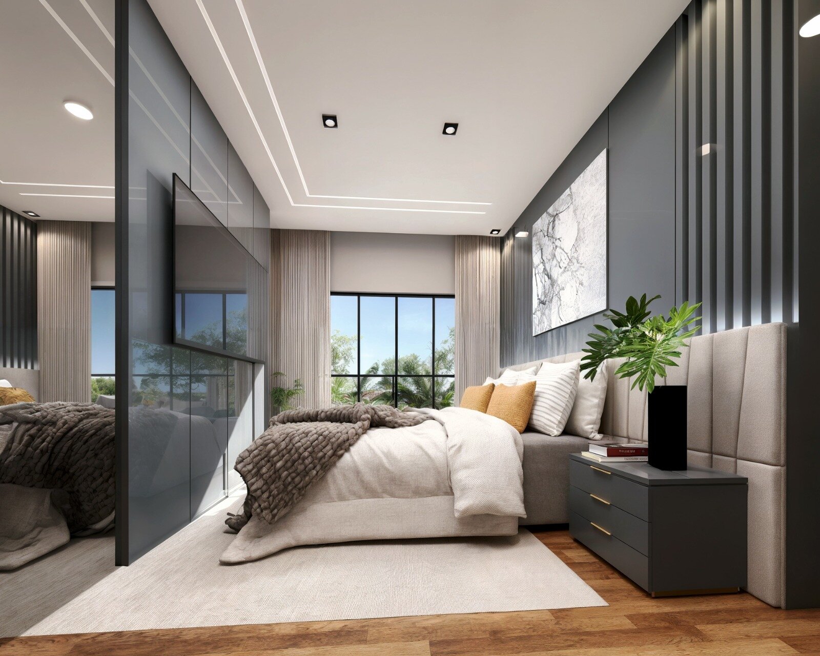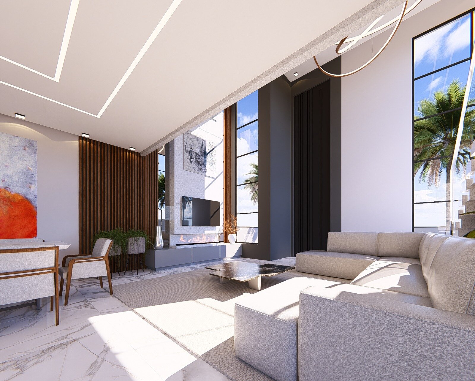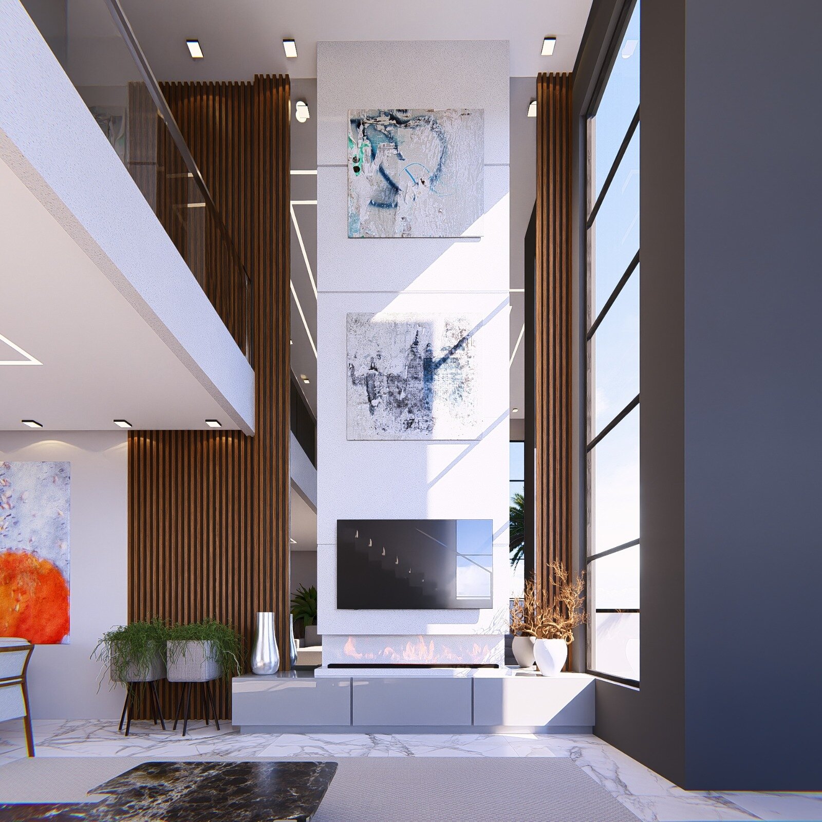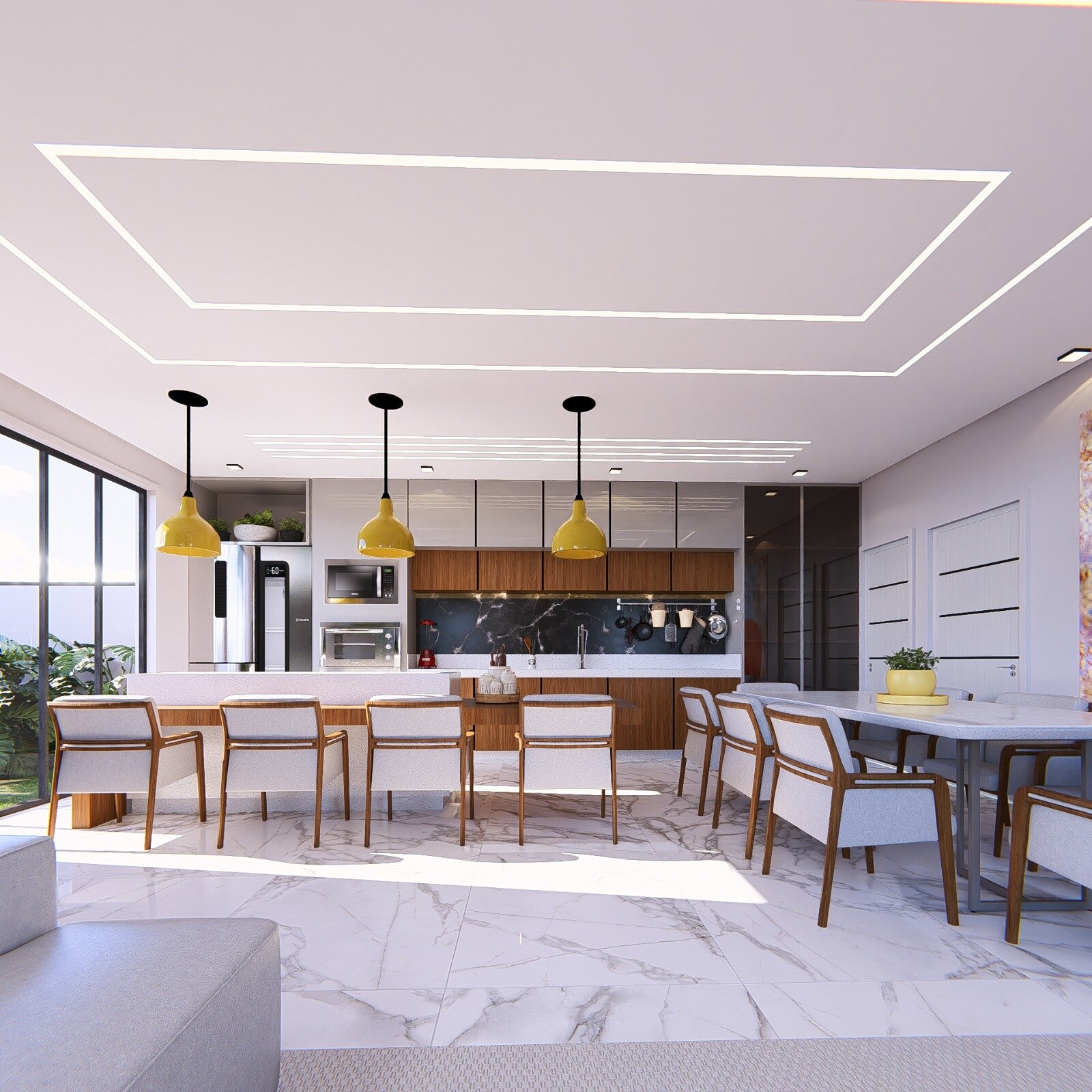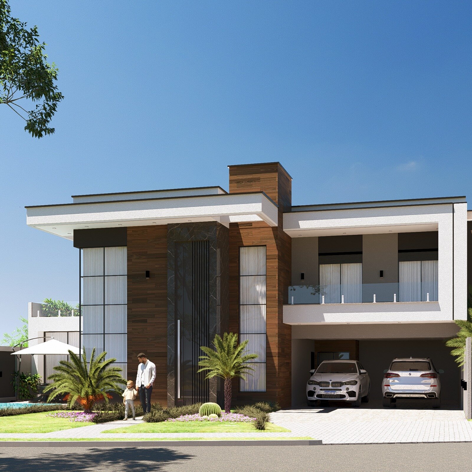 • Sala com pé-direito duplo de 6 metros e porta de entrada imponente em ACM com 5 metros de altura