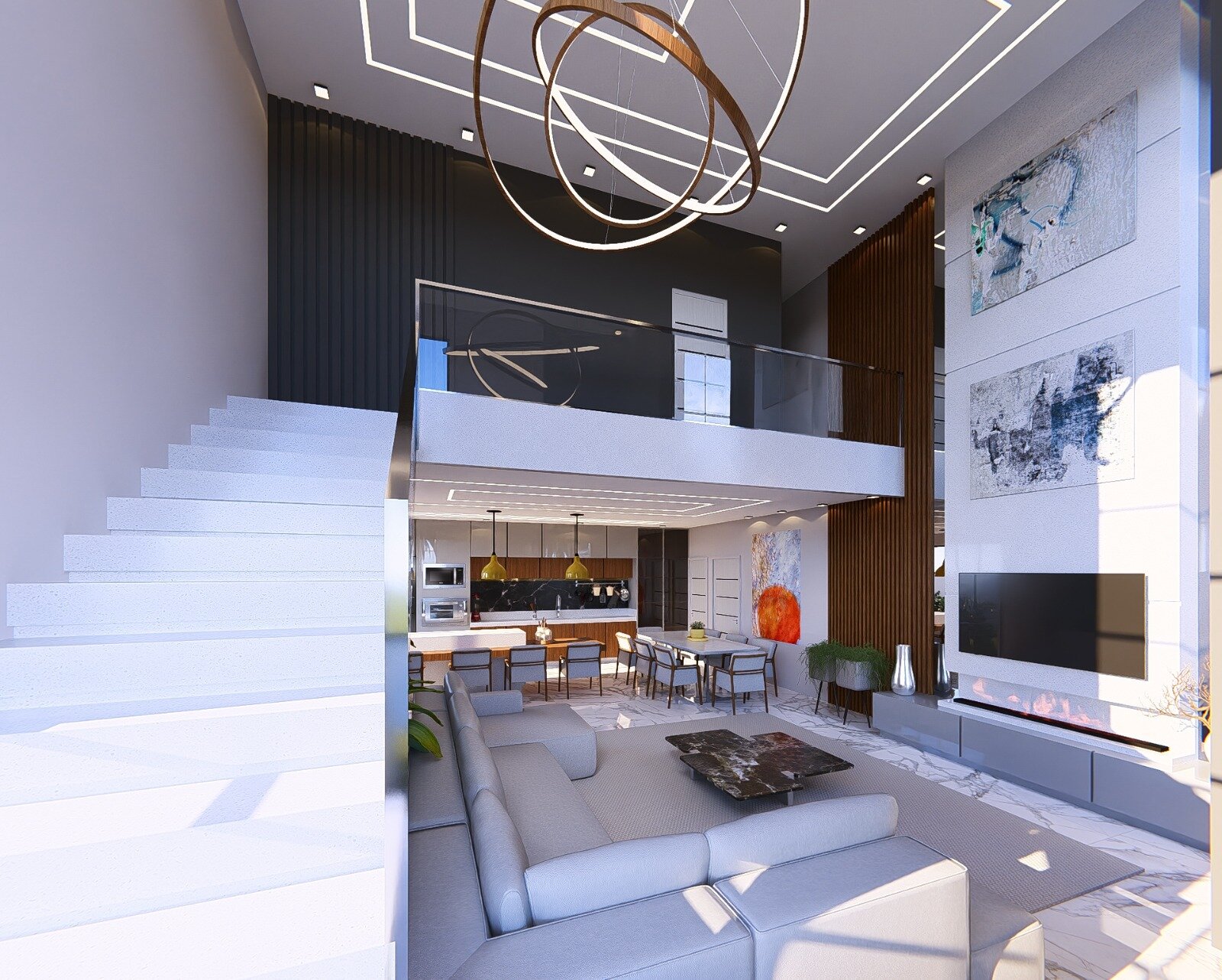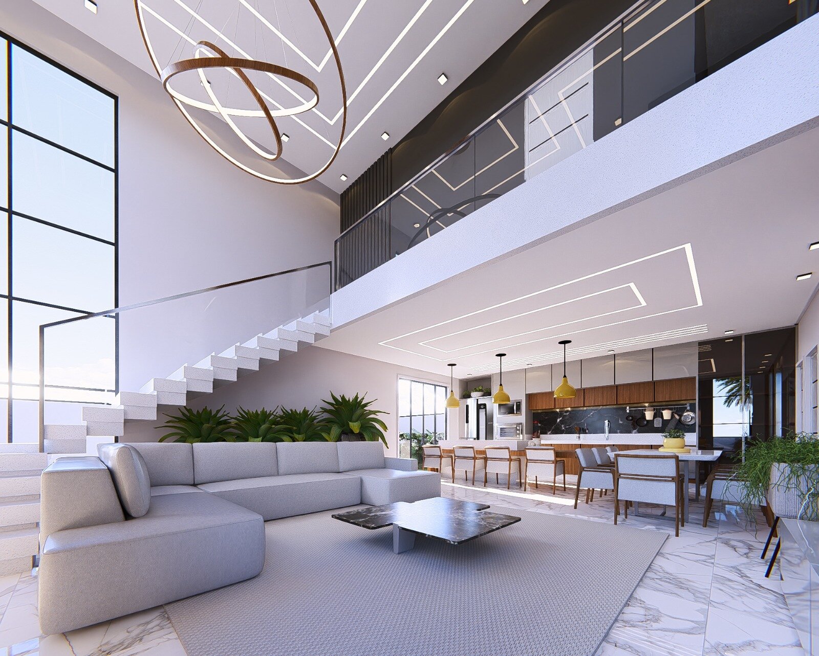 • Escada em porcelanato, lavabo, cozinha americana e copa integrada